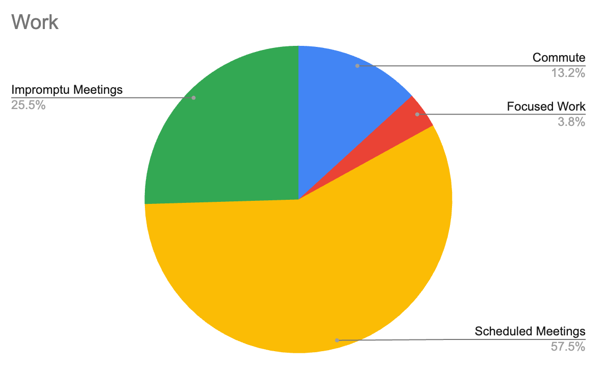 I also wanted to understand what made up most of my work time. Given the percentage here, I was working approximately 65-hour work weeks, that's the equivalent to 13-hour workdays.